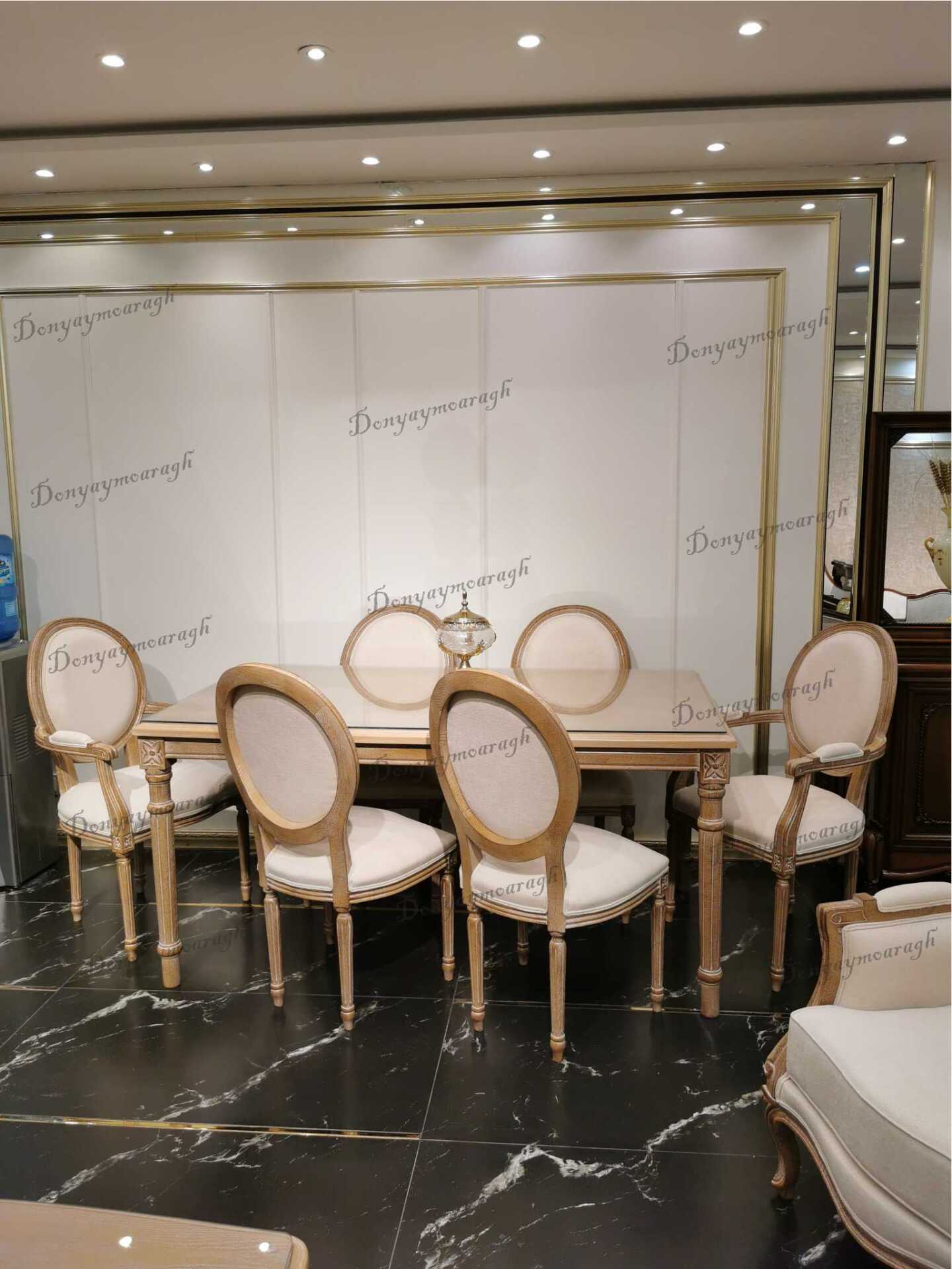 • ۱ عدد میز ۶ نفره (طراحی ظریف با پایه‌های منبت‌کاری شده ظریف و رنگ سندبلاست).